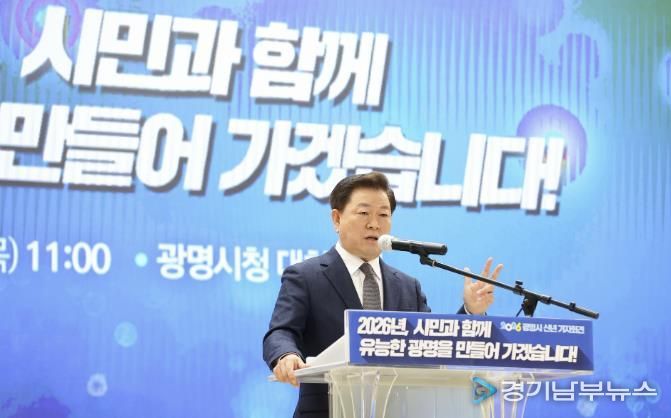 박 시장은 12일 오전 시청 대회의실에서 신년 기자회견을 열고 “지금의 광명은 행정이 주도하는 도시가 아니라 유능한 시민이 스스로 선택하고 참여하며 만들어 온 도시”라며 “2026년은 시민주권, 평생학습, 탄소중립, 자원순환, 사회연대경제, 정원도시, 기본사회 등 광명의 핵심 가치들을 유능한 시민과 함께 완성의 단계로 끌어올리는 해가 될 것”이라고 선언했다.