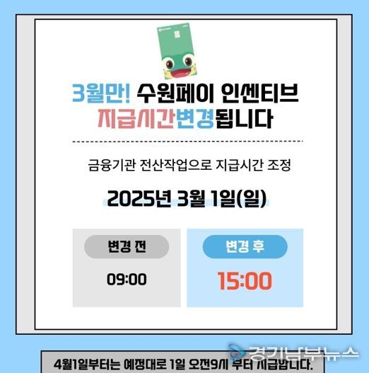 수원페이 인센티브 지급 시작 시각은 매달 1일 오전 9시였지만, 3월 1일 금융기관 전산 작업으로 인해 오후 3시로 늦춰진다. 4월부터는 다시 1일 오전 9시부터 지급한다.