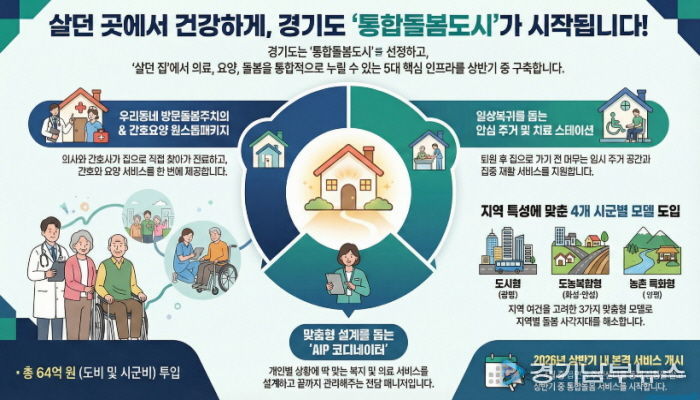 이번 사업은 오는 3월 ‘의료·요양 등 지역 돌봄의 통합지원에 관한 법률’ 시행에 앞서 각 지역의 인구 구조와 특성에 맞춘 ‘경기형 통합돌봄 모델’을 구축하려는 선제적 조치다. 경기도는 도비와 시군비 총 64억 원의 예산을 투입할 예정이다. 국정 제1 동반자로서 경기도가 통합돌봄 정책 기조를 가장 앞장서서 실천함으로써 경기도의 실행 리더십을 증명하는 의지를 담고 있다.