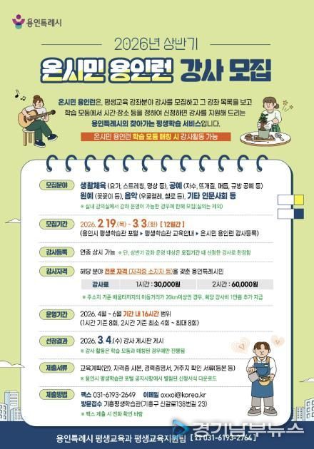 [경기남부뉴스 김혜숙 기자] 용인특례시는 19일부터 3월 3일까지 시민이 원하는 시간과 장소로 강사가 찾아가는 배달학습 ‘온시민 용인런’ 강사를 모집한다고 밝혔다.