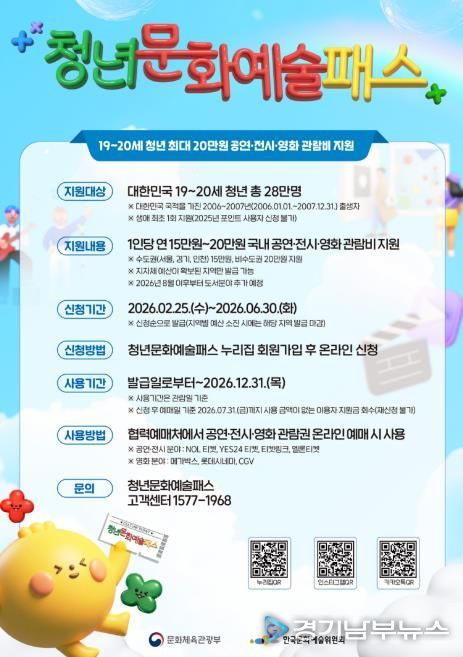 [경기남부뉴스 김혜숙 기자] 안성시는 지역 청년들의 문화 향유 기회를 넓히기 위해 ‘2026년 청년문화예술패스 사업’을 확대 시행한다고 밝혔다.