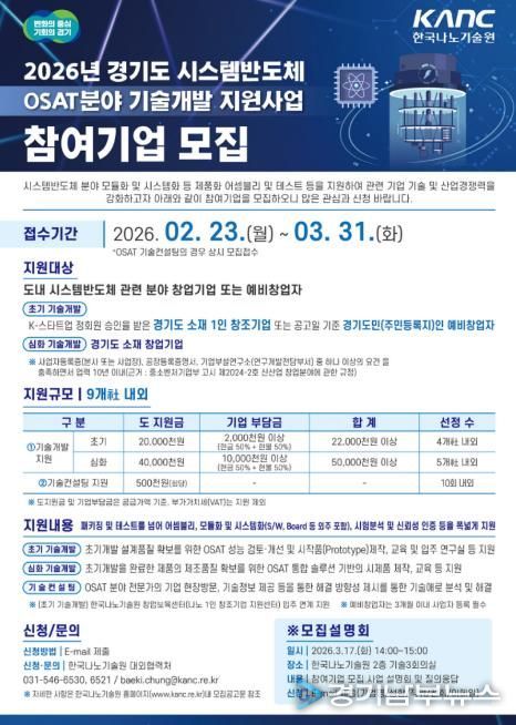 [경기남부뉴스 김혜숙 기자] 경기도가 시스템반도체 산업 생태계 강화를 위해 ‘2026년도 경기도 시스템반도체 후공정(OSAT) 분야 기술개발 지원사업’에 참여할 도내 예비창업자 및 창업기업을 3월 31일까지 모집한다.