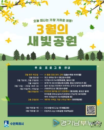 [경기남부뉴스 김정옥 기자] 수원특례시는 3월 한 달간 도시공원에서 다채로운 시민 참여형 봄맞이 프로그램을 운영한다. 생태·문화·체육 활동을 확대해 공원을 일상 속 체험과 여가의 공간으로 활용할 계획이다.