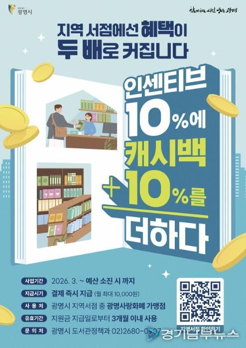 시는 오는 3월 1일부터 관내 지역서점에서 광명사랑화폐로 도서를 구매하면 결제 금액의 10%를 캐시백으로 지급하는 ‘도서구입비 10% 캐시백’ 사업을 시행한다.