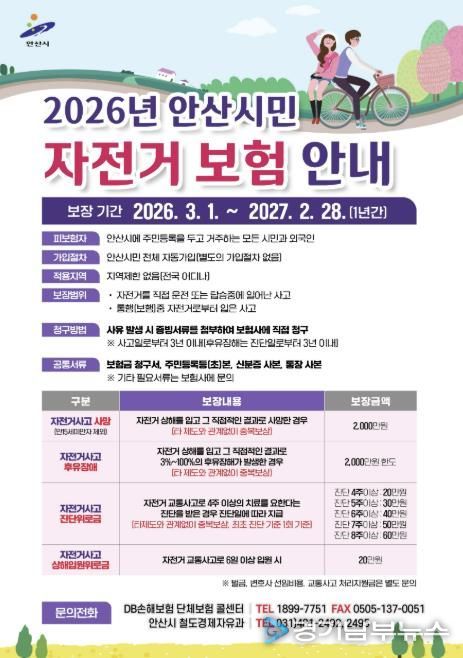 [경기남부뉴스 김혜숙 기자] 안산시는 시민들이 자전거 이용 중 발생할 수 있는 각종 사고에 대비할 수 있도록 ‘안산시민 자전거보험’에 가입했다고 5일 밝혔다.