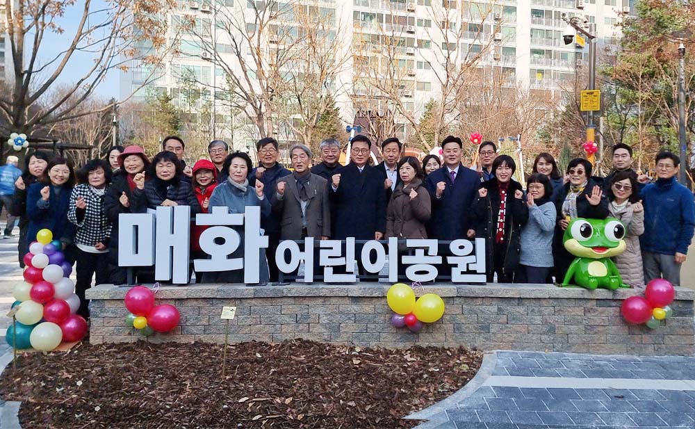 5일 매여울᛫매화어린이공원 리모델링 준공식이 개최돼 최종현 의원이 공사 관계자와 주민에게 그동안의 과정을 설명하며 감사를 전했다.