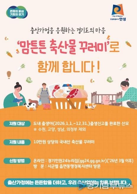 이에 따라 경기도에 주소를 두고 2026년 1월 1일~12월 31일까지 안성시에 자녀 출생신고를 마친 산모에게 1인당 10만 원 상당의 국내산 축산물 꾸러미를 지원한다.