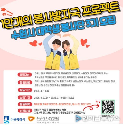 [경기남부뉴스 김정옥 기자] 수원시청소년청년재단 수원시청년지원센터는 3월 3일부터 3월 13일까지 지역사회 봉사 문화를 확산하고 대학생들의 사회공헌 활동을 지원하기 위한 '1만 개의 봉사발자국' 참여 동아리를 모집한다.
