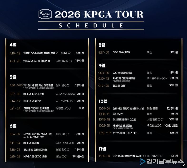 [경기남부뉴스 김혜숙 기자] ㈜한국프로골프투어(대표이사 김원섭, 이하 KPGT)가 3월 5일, 2026 시즌 KPGA 투어 일정을 발표했다.
