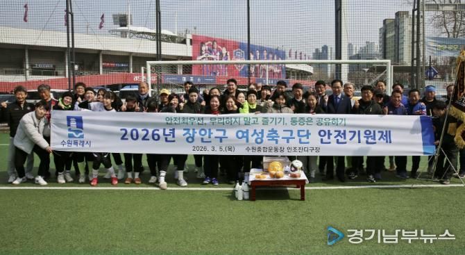 [경기남부뉴스 김정옥 기자] 수원시 장안구 여성축구단은 지난 5일, 수원종합운동장 인조잔디구장에서 선수단과 관계자 등 30여 명이 참석한 가운데 2026년 안전기원제를 진행했다.