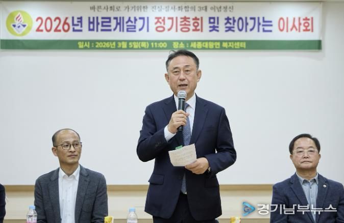 [경기남부뉴스 김혜숙 기자] 지난 3월 5일 세종대왕면 복지회관에서 세종대왕면 바르게살기운동 위원회 정기총회가 개최됐다. 이날 총회에는 이충우 여주시장을 비롯해 박시선 여주시의회 의원, 김희수 세종대왕면장, 심덕보 위원장을 비롯한 바르게살기 운동 회원 등 30여 명이 참석해 단체 운영과 지역사회 발전 방안을 논의했다.
