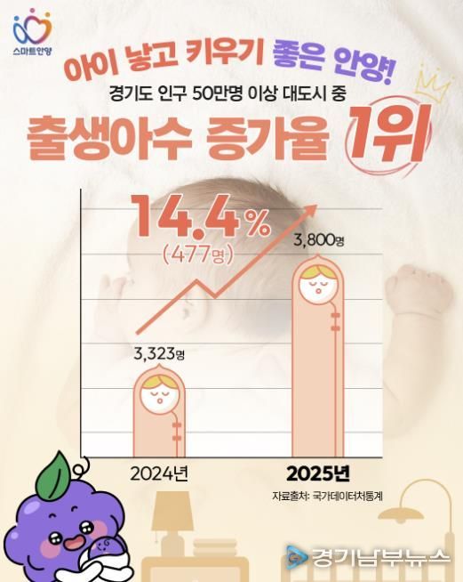 국가데이터처가 지난달 말 발표한 국가통계포털(KOSIS) 잠정 통계에 따르면, 2025년 안양시의 출생아 수는 총 3,800명으로, 2024년(3,323명) 대비 14.4%(477명) 급증하며 도내 인구 50만 이상의 지자체 중 가장 높은 상승폭을 기록했다.