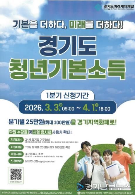 [경기남부뉴스 김혜숙 기자] 오산시는 24세 청년에게 분기별 25만 원을 지급하는 ‘청년기본소득’ 2026년 1분기 신청을 3월 3일부터 4월 1일까지 접수한다고 밝혔다.