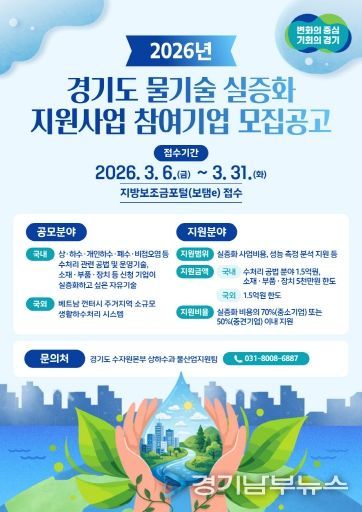 [경기남부뉴스 김혜숙 기자] 경기도가 ‘2026년 경기도 물기술 실증화 지원사업’ 참여 기업을 공개 모집한다.