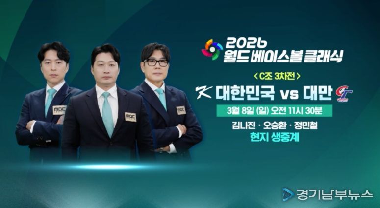 [경기남부뉴스 홍수정 기자] 2026 월드 베이스볼 클래식(WBC) 1라운드에서 대한민국이 8강 진출을 향한 중요한 승부를 앞두고 있다. MBC는 오늘(8일) 오전 11시 30분부터 일본 도쿄돔에서 열리는 대한민국과 대만의 WBC 1라운드 3차전 경기를 도쿄 현지에서 생중계한다.