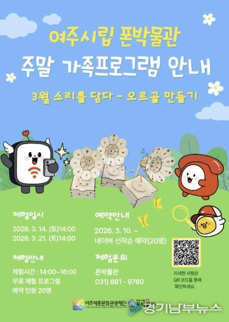 [경기남부뉴스 김혜숙 기자] 여주세종문화관광재단 여주시립 폰박물관은 2026년 3월부터 11월까지 매월 주말 가족체험 프로그램을 운영하며, 3월 체험 프로그램 '소리를 담다 – 오르골 만들기' 참여자를 모집한다.
