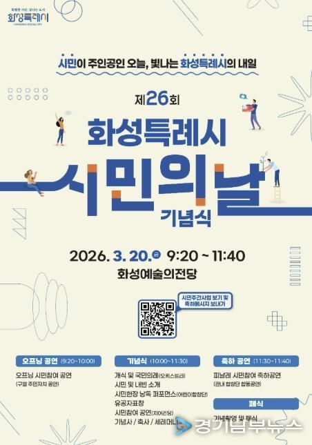 한편, ‘제26회 화성특례시민의 날’ 기념식은 3월 20일 오전 10시 화성예술의전당에서 열린다. 이번 기념식은 ‘시민이 주인공인 오늘, 빛나는 화성특례시의 내일’이라는 슬로건과 함께 시민이 무대를 꾸미는 참여형 행사로 진행된다.