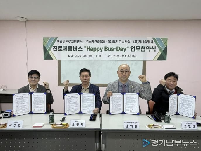 [경기남부뉴스 김혜숙 기자] 의왕시청소년재단 산하 의왕시진로지원센터 ‘꿈터’가 청소년들의 진로 탐색을 지원하기 위해 3월 9일 관내 운수업체와 ‘진로체험버스’ 운영을 위한 업무협약(MOU)을 체결했다.