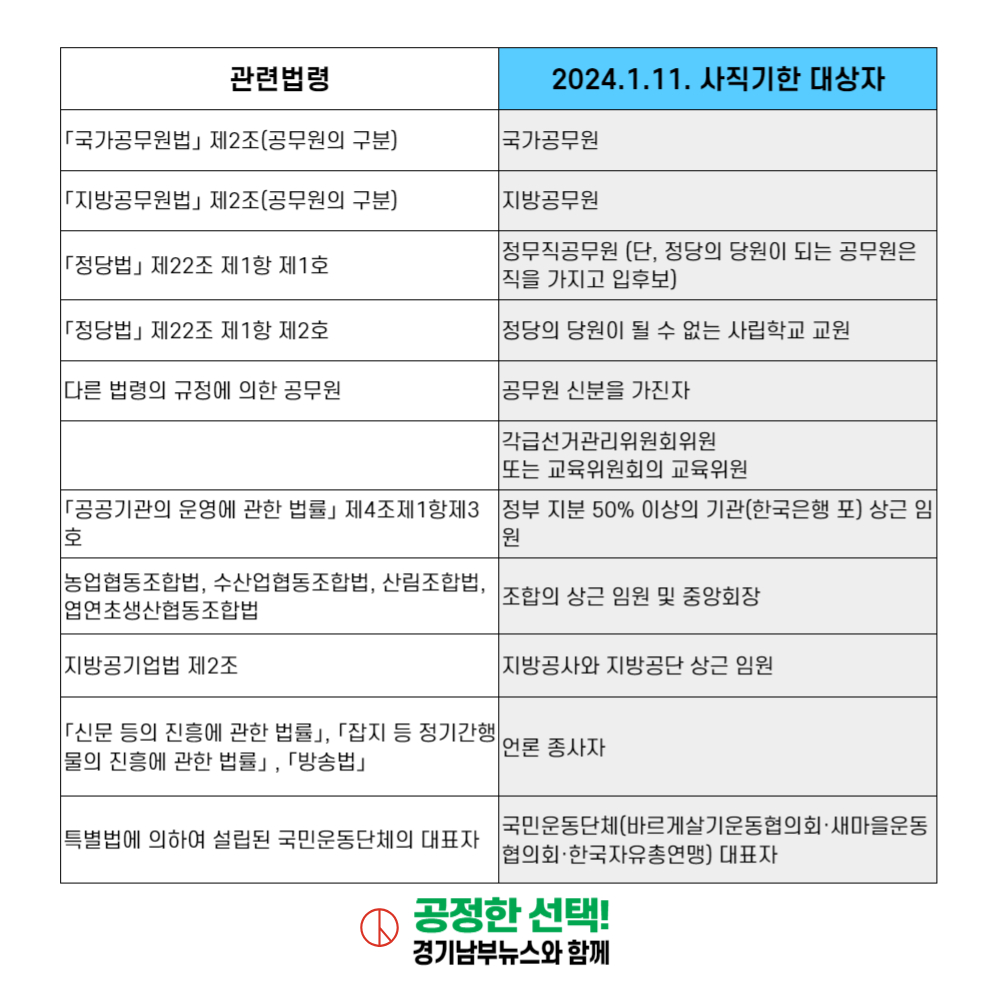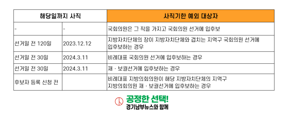 1월 11일은 선거일전 90일에 해당하며 소속기관의 장이나 소속위원회에 사직원이 반드시 이 날까지 접수되야 한다. 경기남부뉴스는 중앙선거관리위원회가 발표한 공무원의 국회의원 입후보 관련 사직기한에 관해 다음과 같이 정리했다.