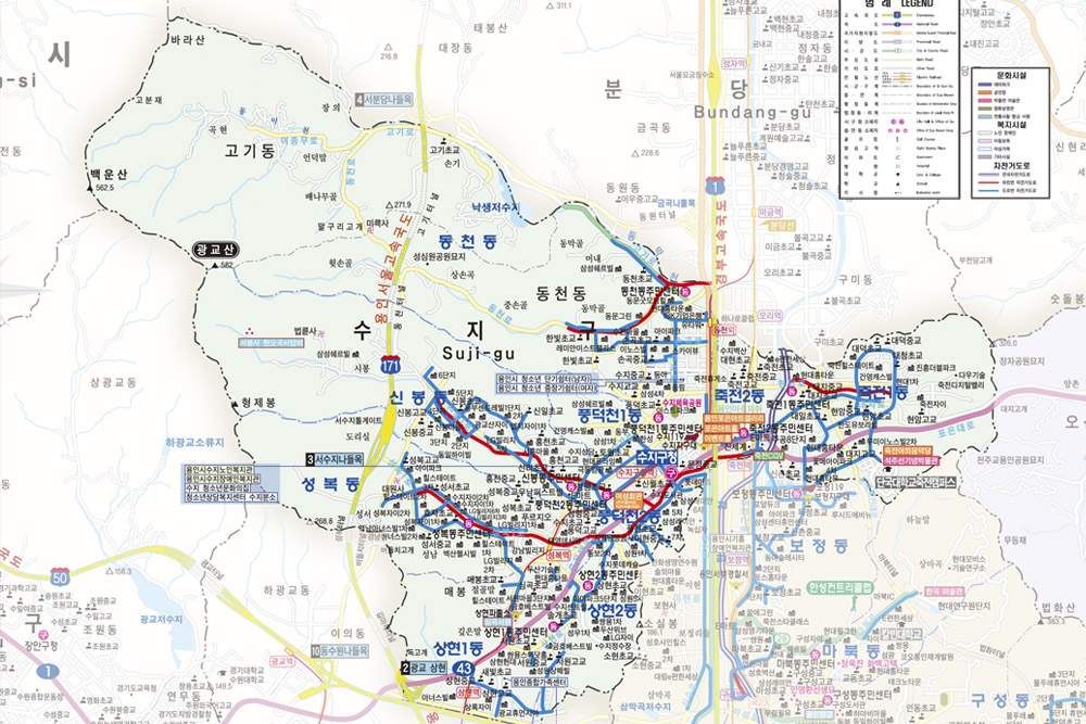 북쪽에 광교산이 있어 서울로 진입하기가 엄청 어렵다. 조금만 수지 지형을 살펴본 사람이라면 ‘고립’이라는 단어를 쓴다. 현재는 고기리 쪽으로 드나드는데 이 길이 너무도 협소해 출퇴근 시간과 주말에는 교통지옥이 따로 없다.