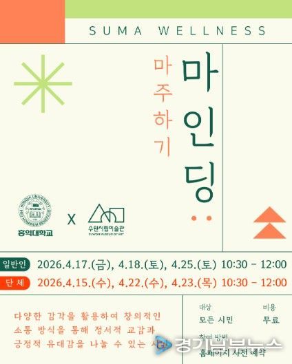 [경기남부뉴스 김정옥 기자] 경기도 수원시립미술관은 고령화, 우울, 사회적 단절 등의 문제를 예술로 접근하고, 치유하는 사회적 처방 프로그램 2026 'SUMA 웰니스(Wellness) 마인딩: 마주하기'를 4월 15일부터 운영한다.