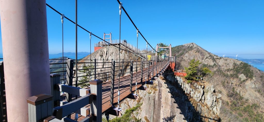 지리산~촛대봉~달바위~가마봉~옥녀봉을 거치는 능선(달바위 칼날암릉능선)과 급경사 철재계단 그리고 출렁다리는 스릴을 즐길 수 있으며, 수려한 경관의 바위산과 푸른 물살이 넘실대는 바다를 배경으로한 한폭의 그림같은 순박한 섬마을을 품은 산이다. 또한, 산행을 시작하면 급경사를 오르다 보면 돌밭길이 나오는데 시야에 들어오는 바다 풍경 덕에 돌길이 지루하지 않고 아기자기하기만 하다. 행여 주위 경관에 시선을 빼앗겨 발이라도 헛디딜까 걱정이 될 정도다.
