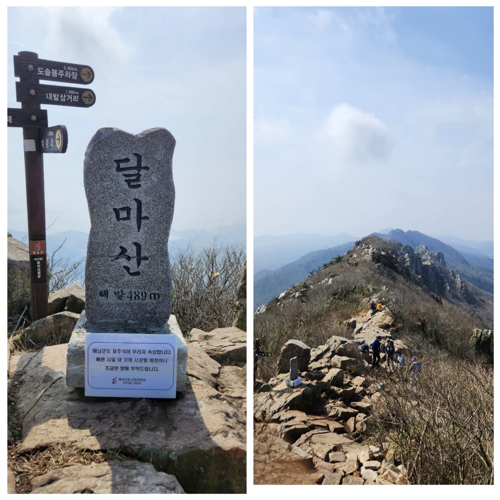 너덜에서 인증을 하고 미황사 등산로 입구에서 달마산 정상을 오른다. 새벽 때와는 다르게 습기가 없어 오르기 좀 수월하다. 헬기장을 지나니 본격적인 너덜 암릉을 오르며 정상에 이르는다. 정상에서의 뷰는 멋있고 바다에서 불어오는 바람에 몸의 열기를 식히며 쉼을 가지며 바나나와 땅콩으로 배를 채웠다.