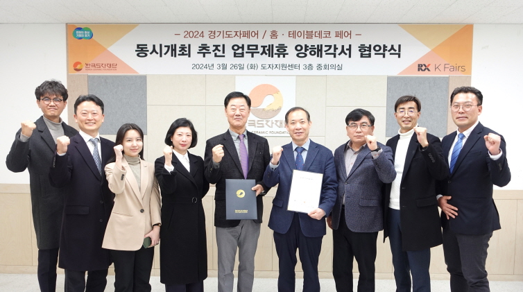 협약은 두 행사의 성공을 위한 양 기관의 적극적 협력을 위한 것으로 ▲국내외 전시·행사 동시 개최 및 특별관 운영 ▲페어 참가사-바이어 매칭 프로그램 운영 ▲도자공예 문화산업 발전을 위한 공동 프로모션 추진 등에 힘을 모으기로 했다.