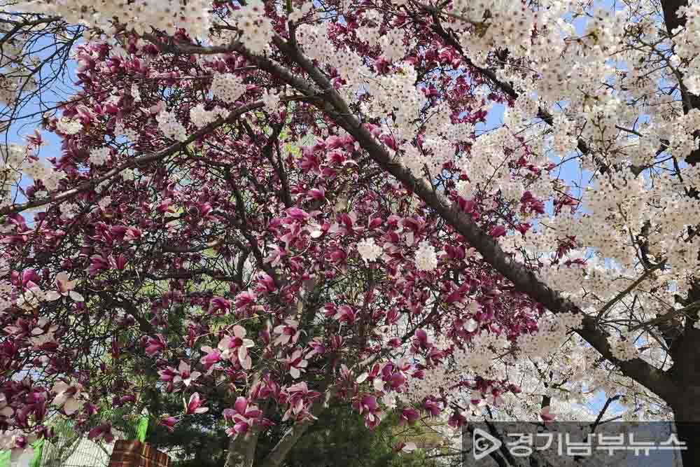 올해는 목련과 벚꽃이 동시에 만개해 등산객들에게 색다른 봄을 선사하고 있다.