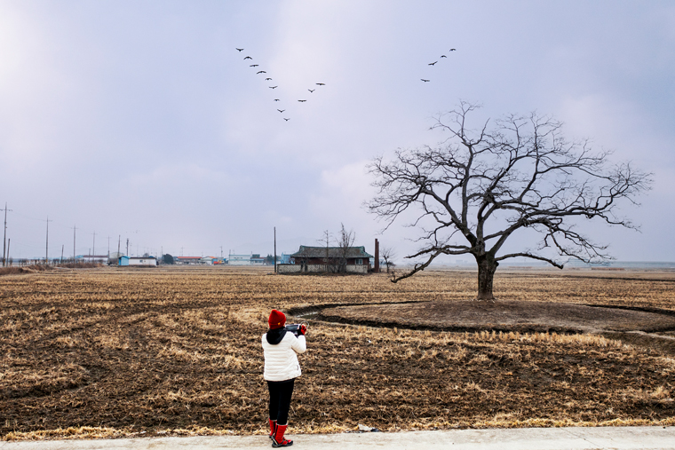 충남 당진의 어느 논바닥에 심어진 팽나무 위쪽으로 모이를 찾아 날아가는 새 무리와 드론을 들고 촬영하는 본 작가의 뒷모습은 새로운 목표와 방향을 찾아 비상하려는 물아일체(物我一體)의 순간이었음을...
