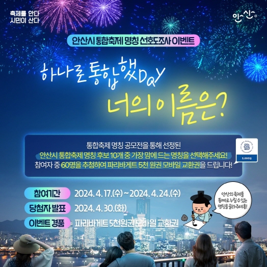 이번 선호도 조사는 안산시청 SNS를 통해 확인할 수 있으며 온라인 투표 형식으로 진행된다. 또한 참여율을 높이기 위해 참여자 중 무작위 추첨을 통해 60명에게 5천 원 상당의 모바일 쿠폰을 지급할 예정이다.