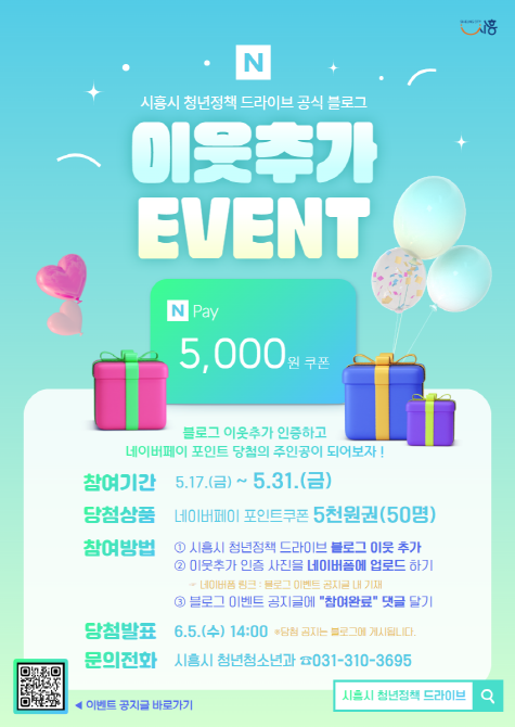 이벤트는 ‘시흥시 청년정책 드라이브 블로그’ 이웃 추가를 한 후 인증 작업을 통해 참여할 수 있다. 참여자 중 50명을 추첨해 네이버페이 포인트 쿠폰 5천 원권을 지급한다.