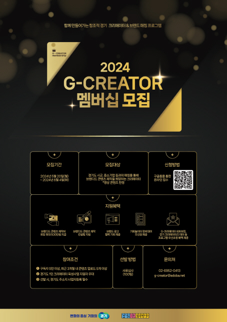 G-CREATOR에는 ▲시군·공공기관·중소기업 관련 콘텐츠 제작비 최대 500만 원 지급 ▲콘텐츠 제작 컨설팅 지원 ▲시군·공공기관·중소기업과의 광고 협력 기회 제공 ▲기회놀이터 장비대여 우선권 제공 ▲프로그램 우선초청 등의 혜택이 주어진다.