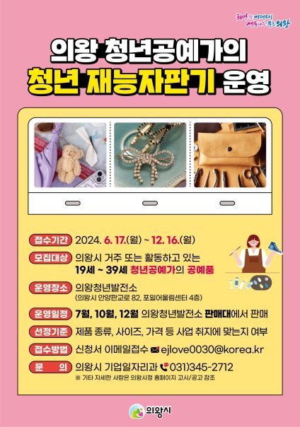 접수 기간은 6월 17일부터 12월 16일까지이며, 접수된 공예품 중 선정된 제품은 7월, 10월, 12월에 각 4주간 ‘청년 재능자판기’로 운영된다.