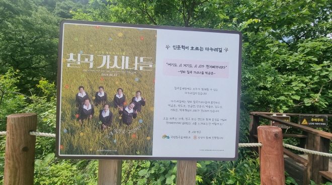 경상북도에 있는 국립칠곡숲체원에가면 모두가 함께 할 수 있는 다누리길이 있다. 다누리길에는 영화 칠곡가시나들에 출연하신 박금분, 곽두조, 강금연, 안윤선, 박월선, 김두선, 이원순, 박복형님의 시화가 전시되어 있다.