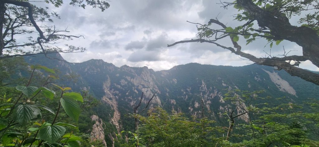 15일(토) 이른 아침 산악회버스를 타기 위해 사당역으로 이동을 하는데 비가 촉촉하게 내리고 있다. 설악산을 가는 내내 비가 내리고 일기예보는 수시로 비가 온다 안 온다를 반복 예보했다. 10시 30분에 도착하여 보니 오후 2시부터 집중폭우가 온다는 예보에 비옷을 챙기고 한계령휴게소에서 산행을 시작했다. 한계령삼거리까지 급경사를 오르락내리락을 반복하며 가는 중 나무테크 계단에 앉은 모녀와 119 구조대원들도 만났다. 어린아이가 발목을 삐어 구조대원들에게 업혀 내려가는 모습을 보니 산에서는 항상 안전이 제일이라는 생각이 든다. 한계령삼거리에 도착하여 인증하고 오른쪽 방향인 대청봉으로 올랐다. 너덜구간들을 지나고 양옆으로 공룡능선과 외설악을 보니 참으로 멋진 풍광에 감탄이 절로 나온다. 끝청에 도착하여 대청봉과 그 너머 동해바다를 보며 여유로운 점심을 먹는다.