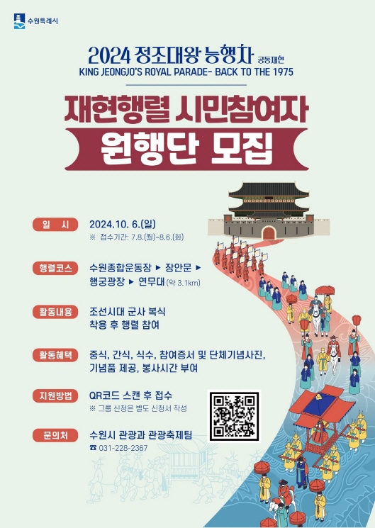 수원시가 ‘2024년 정조대왕 능행차 재현행렬’에 참여할 시민 참여자 ‘원행단’을 8월 6일까지 모집한다.