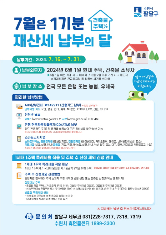 수원시 팔달구는 6월 1일 기준 주택 및 건축물 소유자를 대상으로 2024년 7월 정기분 재산세 111,620건 272억원(주택 1기분 126억원, 건축물(선박포함) 146억원)을 부과 고지했다. 이는 전년 부과 세액 대비 5.53%가 증가한 것이다.