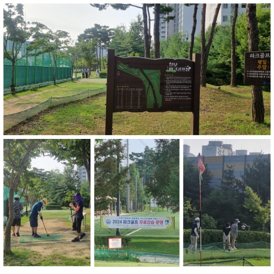 4일 아침 집 앞 공원 산책길에 삼삼오오 짝을 지어 파크골프를 치는 어르신들을 보았다. 특히 부부팀이 많이 나와 있었다. 이른 아침부터 활기차게 운동을 하는 모습을 보니 보기 좋았다. 골프장에 대해 궁금해 물어보니 “수원시에는 1개의 파크골프장이 있다고 했다. 120만 인구가 있는데 너무 적은 것 같다고 했다. 홀도 9홀이고 18홀은 돼야 좋을 거 같다고” 했다. 그래도 이런 장소가 있어 운동도 되고 많이 건강해졌다며 시간이 되면 파크골프를 한번 쳐 보라고 권했다. 프랭카드를 가르치며 저기에 연락하면 무료로 골프 기본 동작도 배울 수 있다고 했다. 현재 회원은 400여 명이 된다고 한다. 또, 골프를 치기 위해 아주대 쪽에서 온 어르신은 “다른 지역에도 골프장이 생기면 더 많은 분이 건강한 취미 생활을 할 수 있을 거 같다.”라고 말했다. 남녀노소 누구나 즐길 수 있는 운동으로 체육 활성화에도 앞으로 많은 기여를 할 수 있을 거 같다. 위치는 권선구 금곡동 칠보체육공원내에 자리하고 있다.