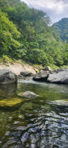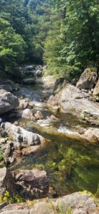 많은 인파와 시원한 물을 밟으며 텀벙텀벙 걷습니다. 돌 들이 미끄러워 조심조심하며 스틱으로 앞을 내디디고, 천천히 걷는데 순간 가슴까지 푹 빠지고, 급물살에 휩싸이며 물에 몸을 맡기며 떠내려가기도 하며, 물속에 무리 떼로 헤엄치는 물고기도 보며 따뜻한 햇볕을 맞으며 아침가리계곡트레킹을 이어간다.