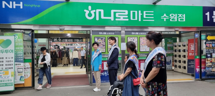 이날 경기도의회 황대호 위원장과 조미옥 시의원, 백해련 국회의원은 마트에 방문하여 장보기에 나선 시민들에게 추석 인사를 전하고 있다.