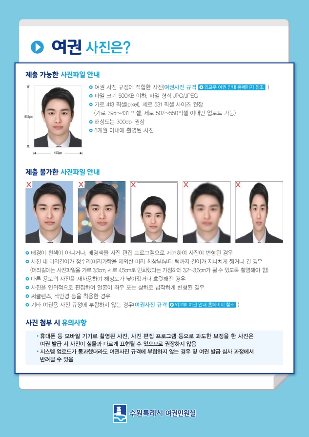 여권 사진은▲최근 6개월 이내 촬영한 사진▲파일 크기500kb이하▲파일 형식JPG/JPEG▲가로413픽셀, 세로531픽셀 사이즈(권장)▲권장 해상도 300dpi등이 요구된다. 여권 사진 규정은 외교부 홈페이지에서 확인하면 된다.