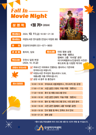 안성의 10월 가을밤, 안성미디어센터 ‘Fall In Movie Night’과 함께 즐기실 시민들은 돗자리, 담요, 의자 등을 지참하여 자유롭게 행사에 참여하시면 된다. 우천 시 행사 일정은 10월 25일 금요일로 연기될 예정이니, 행사에 대한 자세한 사항은 안성미디어센터 홈페이지(www.asmedia.or.kr) 또는 ☎031-671-9830으로 문의하시면 된다.