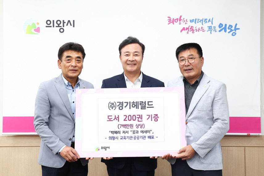 이번 도서 후원은 경기헤럴드 이사로 활동 중인 (주)캐리어중앙공조 김인재 회장과 (주)산본상사 김홍식 회장, (주)대성마리프 이태현 소장, 양경일 한결세무회계사무소 대표 등이 참여해 의왕시 내 교육기관 등에 도서 200권(700만 원 상당)을 기증했다.