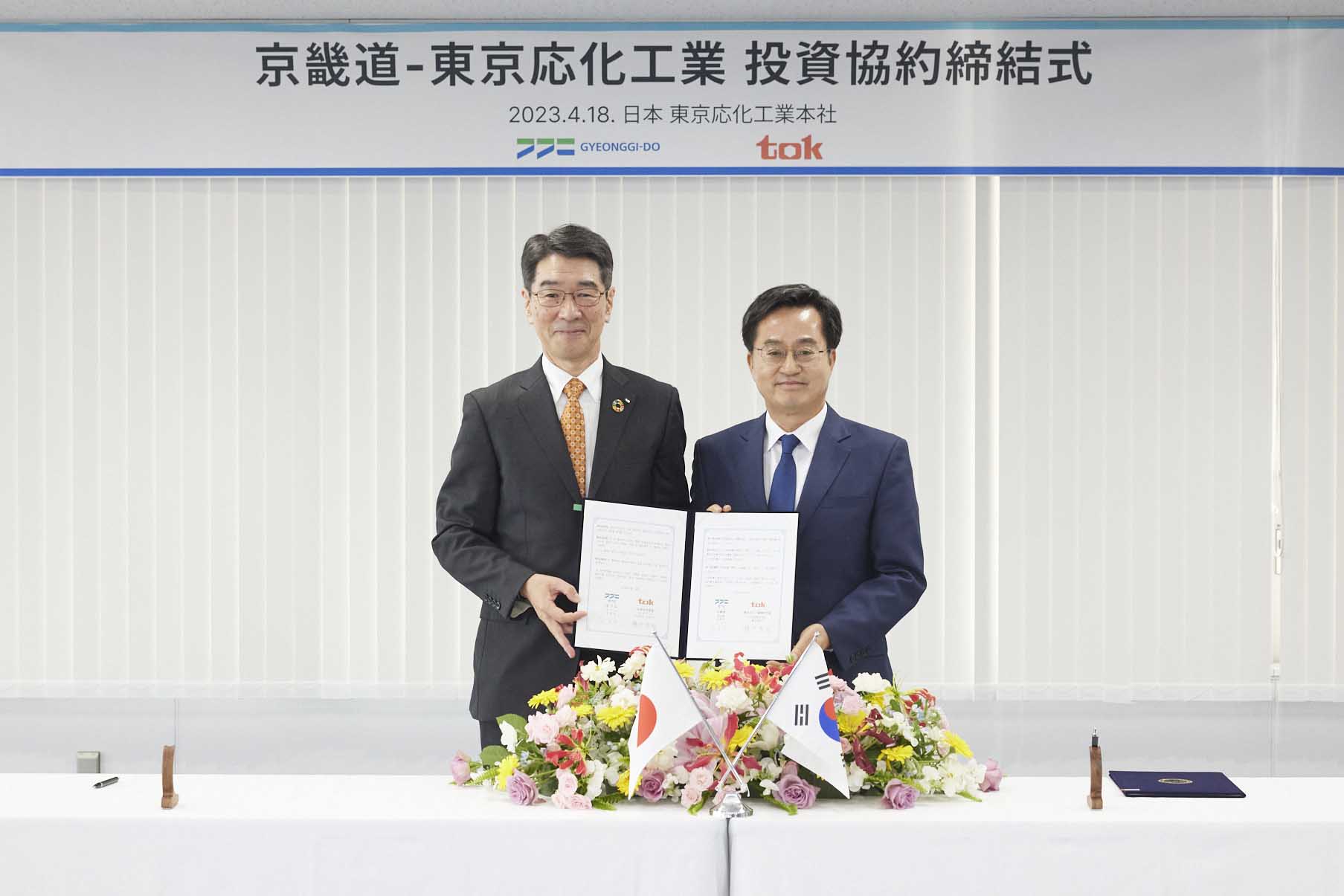김동연 경기도지사는 방일 3일 차인 18일 일본 가나가와현 가와사키시 도쿄오카공업 본사에서 타네이치 노리아키(Taneichi Noriaki) 일본 도쿄오카공업 대표이사와 이 같은 내용의 투자협약을 체결했다.