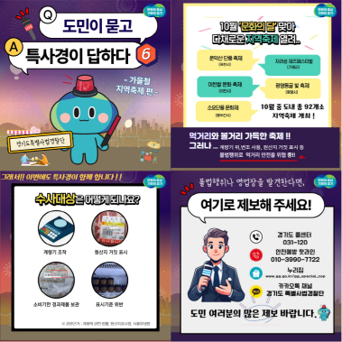 기이도 경기도 특별사법경찰단장은 “가을철 지역축제에서 인기가 많은 식품 등에 대한 점검을 실시해 방문객에게 안전한 먹거리가 공급될 수 있도록 하겠다”면서 “식품안전에 위협이 될 수 있는 불법행위에 대해서는 관련 법령에 따라 강력하게 처벌할 방침”이라고 말했다.