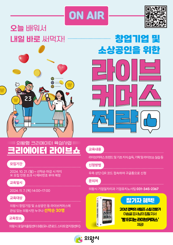 크리에이터 라이브쇼는 11월 7일 오후 2시부터 의왕시 포일어울림센터 8층 스타트업지원센터 오픈세미나실에서 진행되며, 관내 창업기업과 소상공인, 그리고 라이브커머스에 관심 있는 누구나 신청할 수 있다.