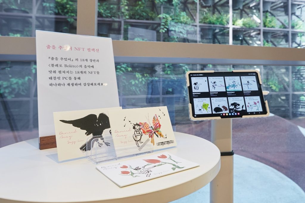 NFT는 대체 불가능한 토큰인 거잖아요. 디지털 파일을 판매하지만 이것이 그냥 복사-붙여넣기를 하면 똑같이 보일 수 있으나 그렇지 않다는 것을 보증해 주는 거죠. 여러분이 구입하신 NFT는 일련번호가 있고 진품임을 인정하고 여러분의 어떤 정보가 같이 들어가 있기 때문에 여러분 것이다 하고 도장을 찍어주는 거죠. 처음에 그림책의 한 장면을 NFT화 해서 판매를 해보자 했는데 저는 새로운 걸 해보고 싶어서 NFT로 책을 만들어보고 싶다고 했어요. 책은 페이지가 많기 때문에 아직 NFT출판이 적극적으로 검토된 건 거의 없었어요. 페이지를 분절하는 방식으로 생각을 해보자는 의견이 나왔고 볼레로음악이 정말 구체적으로 저에게 들어오기 시작하면서 NFT화 작업을 할 수 있게 되었습니다.