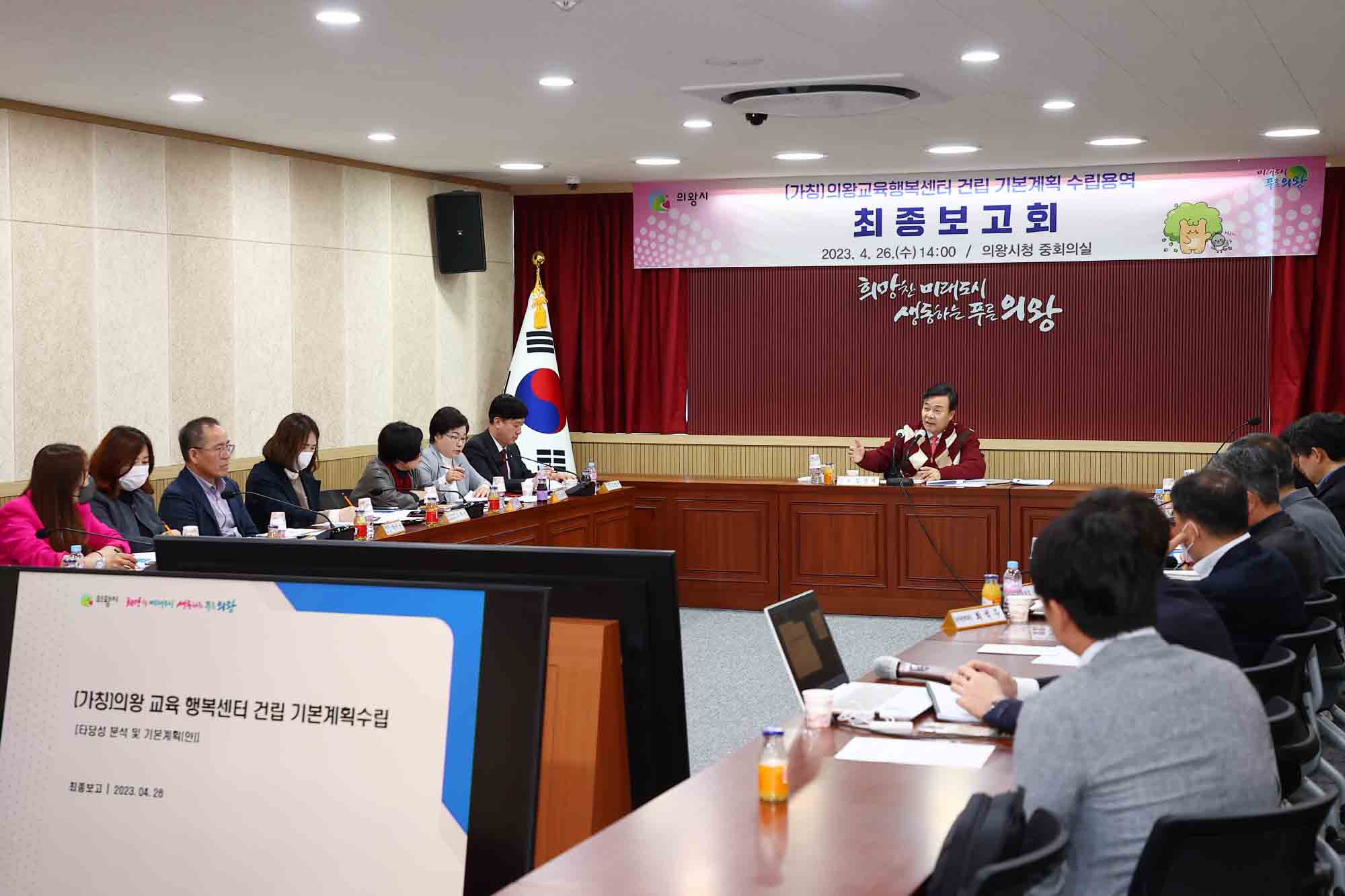오늘 4월 26일 시청 중회의실에서 김성제 시장과 도의회의원, 시의회의원, 관계 전문가 및 공무원 등 20여 명이 참석한 가운데 (가칭) 의왕교육행복센터 건립을 위한 용역 최종보고회를 개최했다.