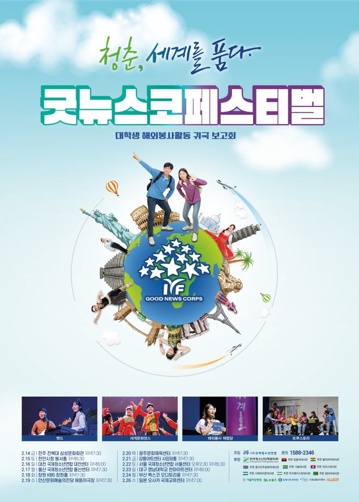 국제청소년연합(IYF)이 주최하는 ‘2025 굿뉴스코 페스티벌(GOODNEWS CORPS FESTIVAL)’이 2월 14일부터 26일까지 서울, 부산, 대구, 광주, 강릉 등 전국 11개 도시와 일본 오사카에서 순차적으로 개최된다. 이번 행사는 대학생 해외봉사단의 귀국보고회로, 1년간 해외에서 봉사활동을 펼친 대학생들이 그들의 활동 성과를 직접 나누는 특별한 자리다.